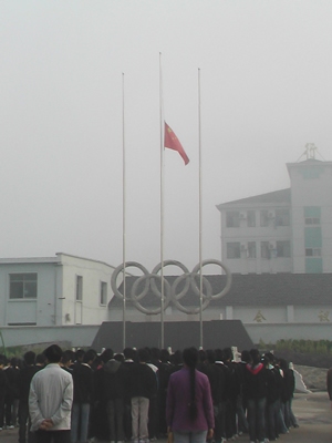 5月19日早6:40,全校师生齐聚雏阳广场举行隆重的升国旗、降半旗仪式,沉痛哀悼在四川地震灾区死难的同胞。国旗护卫队同学在庄严的国歌声中升起鲜艳的五星红旗,全体人员向国旗行注目礼;之后,带着在场人员的沉痛哀悼,国旗又缓缓降下半旗。仪式后,校办主任冯凯鑫同志做了重要讲话,向在四川灾区死难的同胞致哀,指出在这空前的灾难面前,全国人民显示出了空前的团结和坚强,相信在党中央、国务院的坚强领导下,在全国人民的共同努力下,灾区人民一定能战胜灾难,重建家园,中华民族的伟大复兴必将在我们这一代人实现!