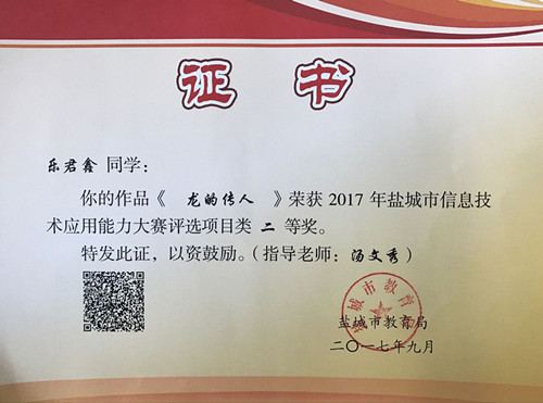 热烈祝贺创新小学乐君鑫同学的作品《龙的传人》荣获2017年盐城市信息技术应用能力大赛评选项目类二等奖!