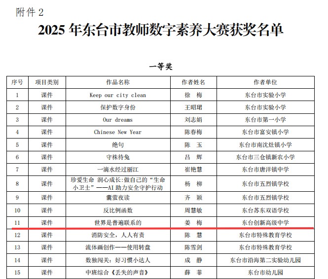 寒梅竞放的冬日,佳音如约而至!我校教师在2025 年东台市师生数字素养大赛中表现亮眼、斩获佳绩,成功摘得一、二、三等奖各 1 项。