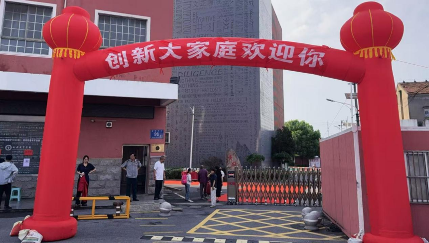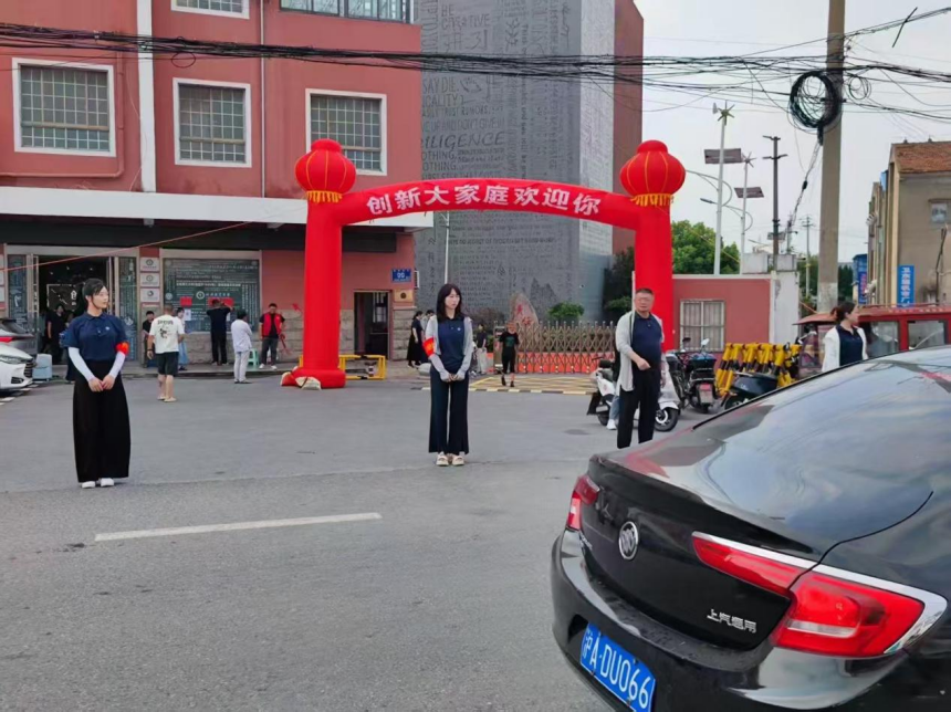 校园内外洋溢着喜庆与温馨的氛围。校门口,一座鲜红的拱门巍然矗立,上面镌刻着“创新大家庭欢迎你”的温暖字样,仿佛是一道通往知识殿堂的虹桥,引领着每位学生和家长迈向新的征程。