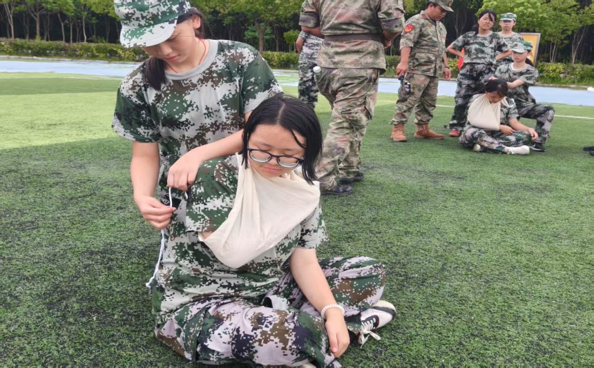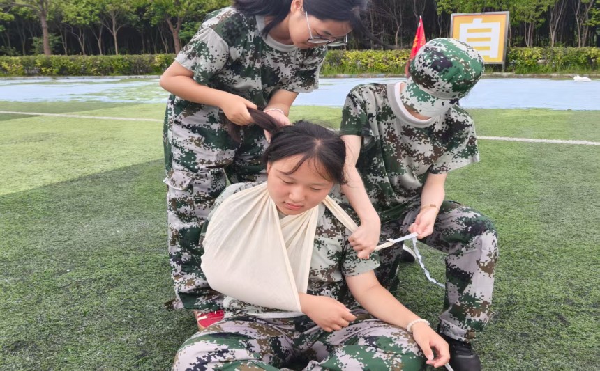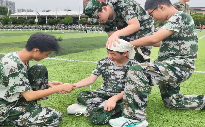 今天,同学们解锁了一项崭新技能。看,神情专注,动作迅捷,他们跪地俯身的地方,不是真正的战场,却进行着一场关乎生命与责任的庄严演练——战场救护训练。经过这次系统学习,同学们掌握了基本的自救、互救能力,具备一定的军事救护技能,深入理解了“人人能救护、人人敢救护”的理念。