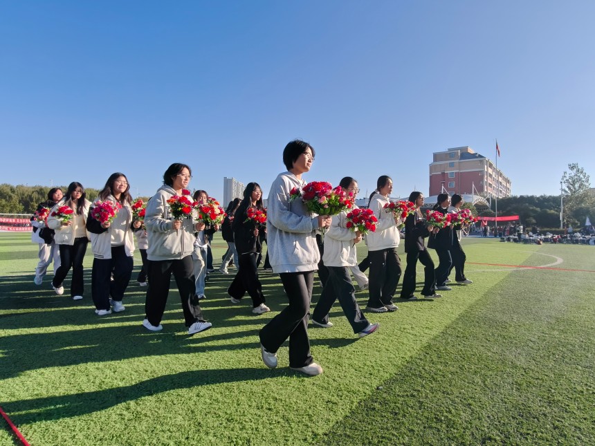 入场仪式上,国旗护卫队昂首挺胸前导,校徽队、会标队、鲜花队与彩旗队步伐整齐,尽显蓬勃朝气。各班级有序进场,创意编排的表演赢得全场阵阵掌声。